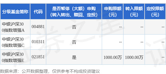 本站消息,12月30日中银基金管理有限公司发布《关于中银沪深300指数增强型证券投资基金暂停大额申购、转换转入及定期定额投资业务的公告》。公告中提示,为保护基金份额持有人利益,自2025年12月30日起中银沪深300指数增强型证券投资基金暂停大额申购、转换转入及定期定额投资业务,下属分级基金调整明细如下:
