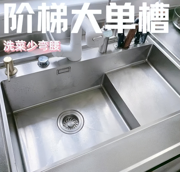 改进舒适性:相比传统水槽,阶梯部分能有效改善清洗时的舒适度,避免锅柄翘起来的尴尬。