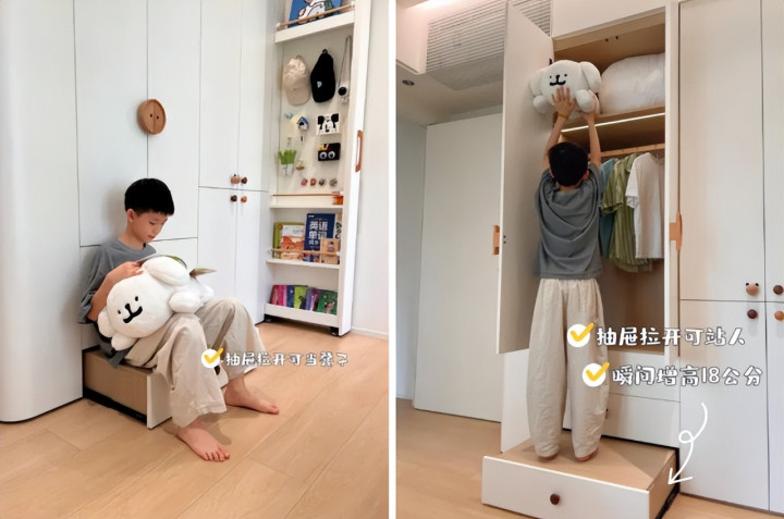 小凳子功能:更重要的是,当你拉开抽屉时,它还能变成一个小凳子,帮助孩子站上去取东西,培养他们的整理和收纳习惯。
